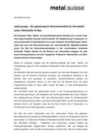 metal.suisse MEDIENMITTEILUNG metal.suisse – Ein gemeinsamer Branchenauftritt für die metallischen Werkstoffe im Bau Die Schweizer Stahl-, Metall- und Fassadenbaubranche befindet sich in einem…