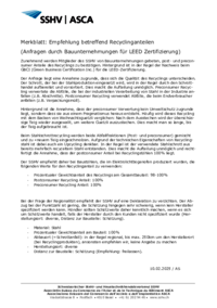 Merkblatt: Empfehlung betreffend Recyclinganteilen (Anfragen durch Bauunternehmungen für LEED Zertifizierung) Zunehmend werden Mitglieder des SSHV von Bauunternehmungen gebeten, post- und preconsumer…